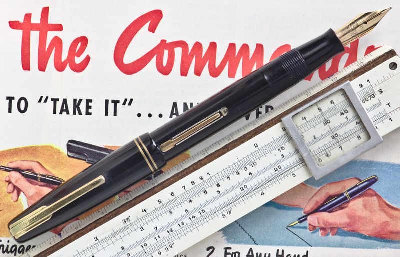 Foto di una penna Waterman. Modello: Commando. Caricamento a levetta. Realizzazione in celluloide nera (jet). Versione ordinaria con finiture dorate.