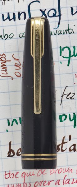 Photo of a pen produced by Waterman. Model: Commando. Filling system: lever filler. In black (jet) celluloid. Detail of cap. Standard version with golden accents.