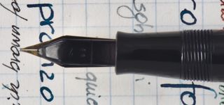 Photo of a pen produced by Waterman. Model: Commando. Filling system: lever filler. In black (jet) celluloid. Detail of feeder. Standard version with golden accents.