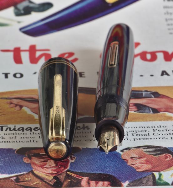 Foto di una penna Waterman. Modello: Commando. Caricamento a levetta. Realizzazione in celluloide nera (jet). Versione ordinaria con finiture dorate.