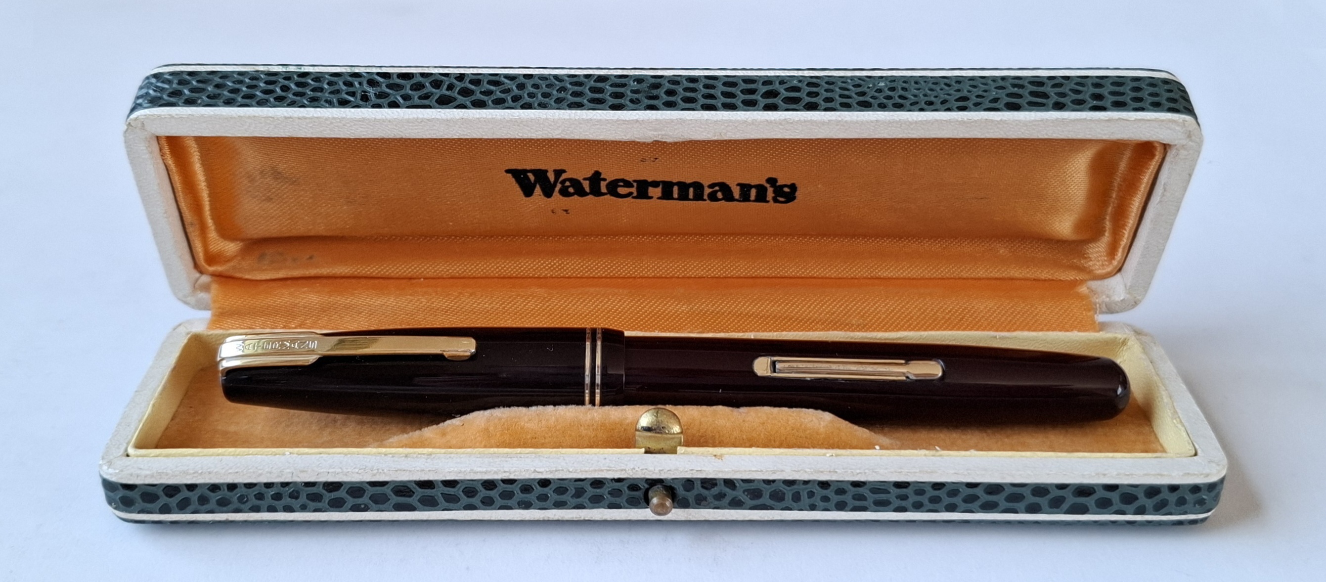Foto di una penna Waterman. Modello: Commando. Caricamento a levetta. Realizzazione in celluloide marrone (maroon). Con rarissimo pennino musicale. Contributo di Giorgio (utente forum Musicus).