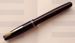 Foto di una penna Waterman. Modello: Commando. Caricamento a levetta. Realizzazione in celluloide marrone (maroon). Con rarissimo pennino musicale. Contributo di Giorgio (utente forum Musicus).