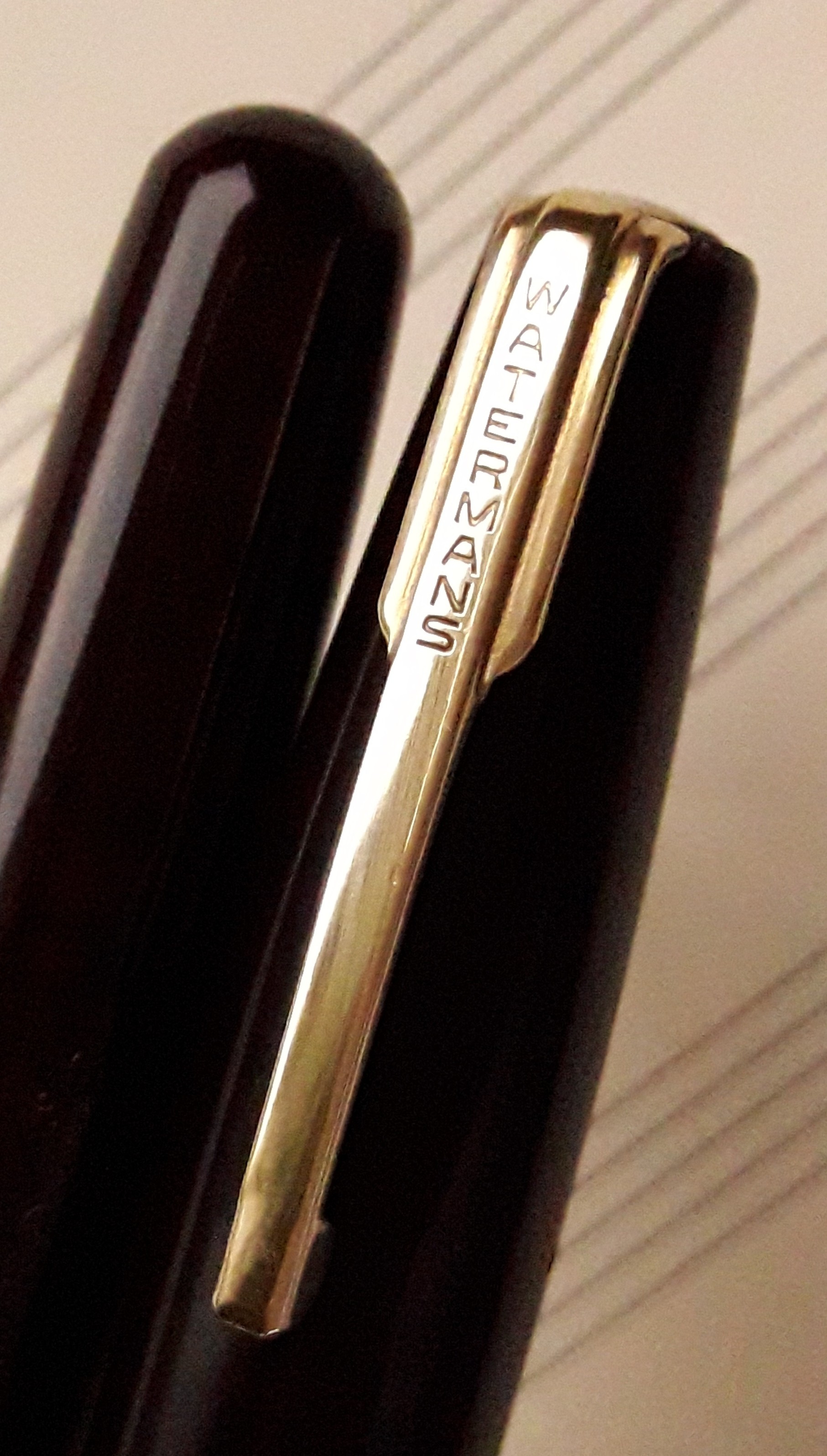 Foto di una penna Waterman. Modello: Commando. Caricamento a levetta. Realizzazione in celluloide marrone (maroon). Dettaglio del fermaglio. Con rarissimo pennino musicale. Contributo di Giorgio (utente forum Musicus).