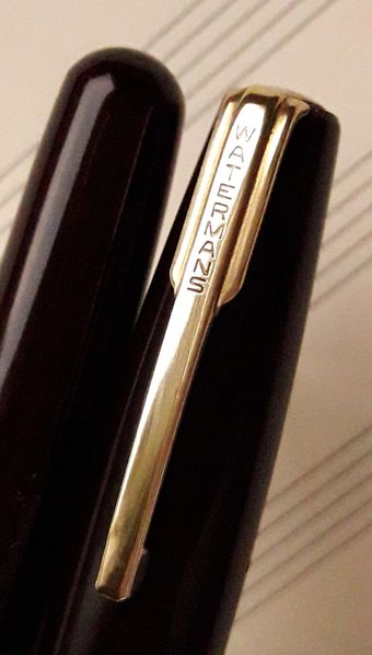 Photo of a pen produced by Waterman. Model: Commando. Filling system: lever filler. In brown (maroon) celluloid. Detail of clip. With rare music nib.