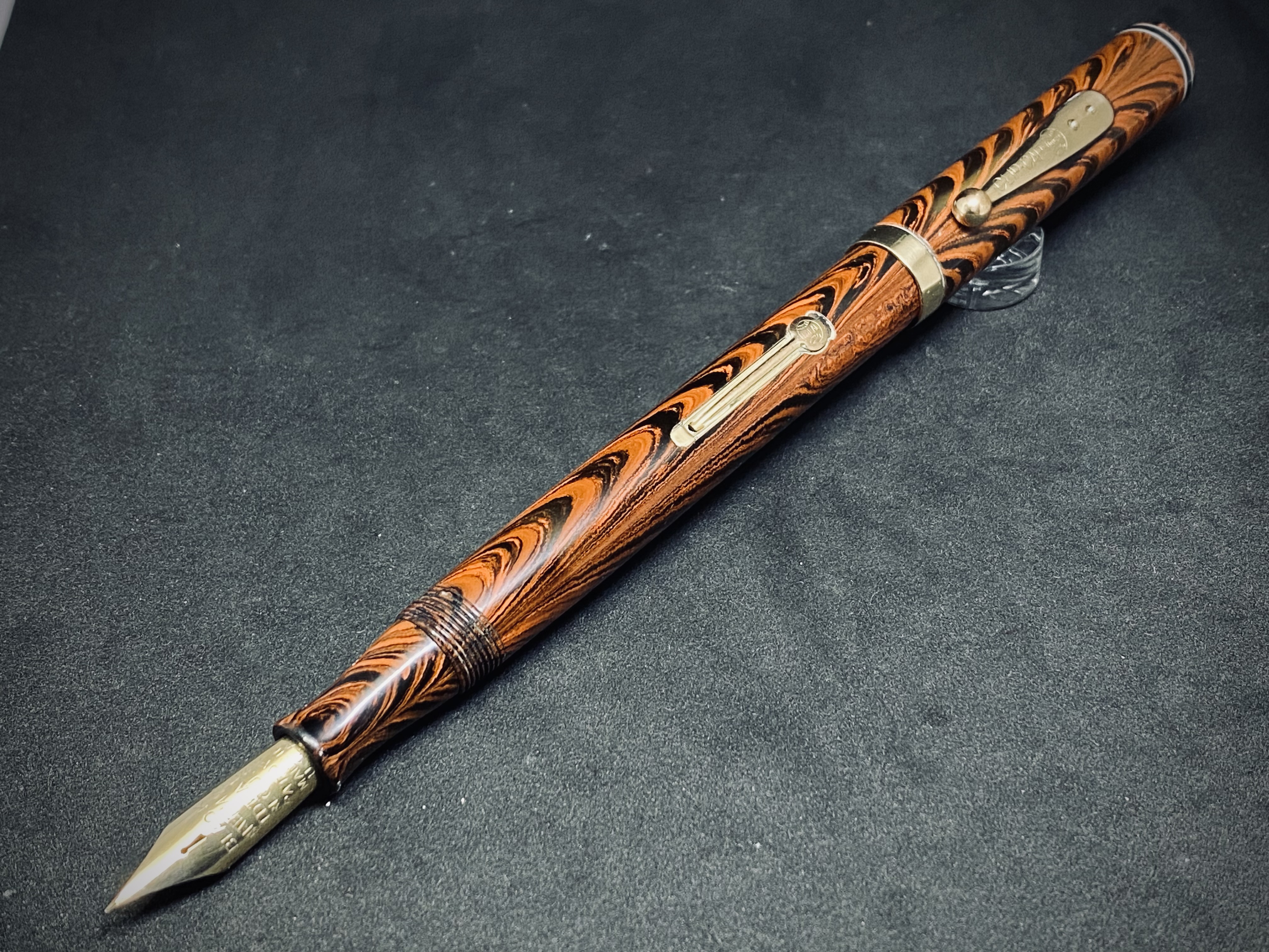 Foto di una penna Waterman. Modello: Ripple No. 7. Caricamento a levetta. Realizzazione in ebanite red ripple. Con pennino di colore Black. Contributo di Francesco (utente forum francoiacc).