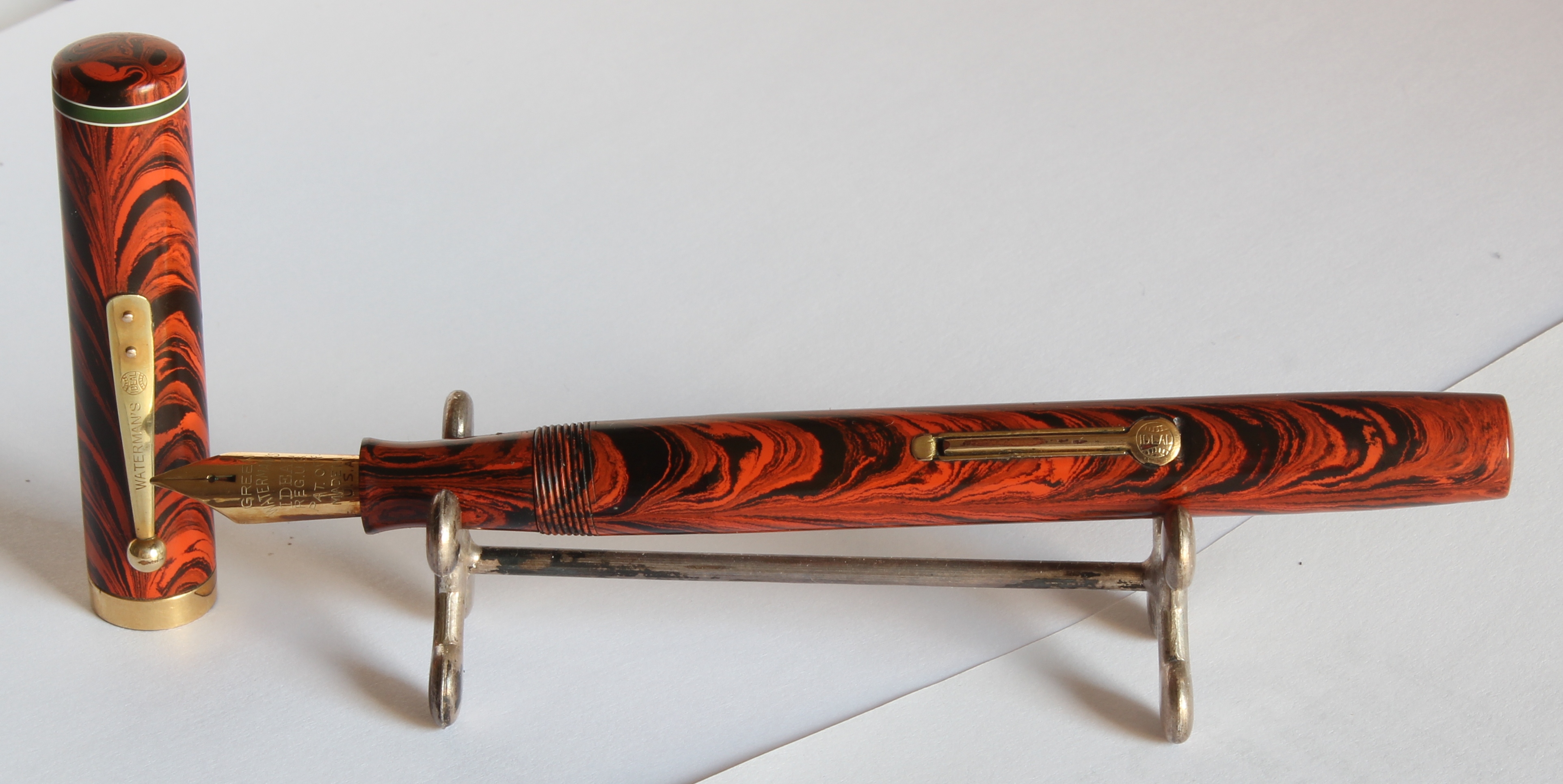 Photo of a pen produced by Waterman. Model: Ripple No. 7. Filling system: lever filler. In rippled hard rubber. With Green nib.