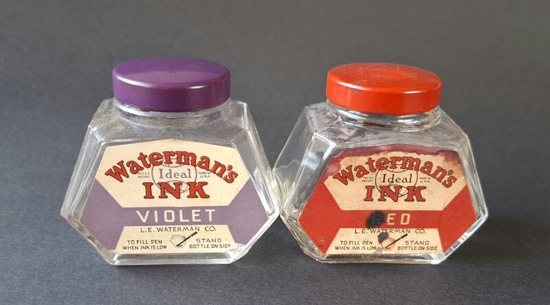 Photo of an ink bottle produced by Waterman. Comparaison between two Tip-Fill Bottle ink bottles, one for red, one for violet.