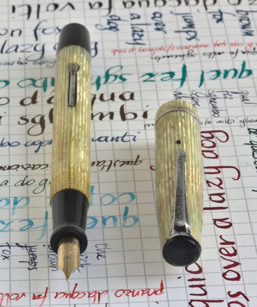 Foto di una penna Wearever. Caricamento a levetta. Realizzazione in celluloide rigata avorio. Modello ignoto. Peculiare alimentatore trasparente.