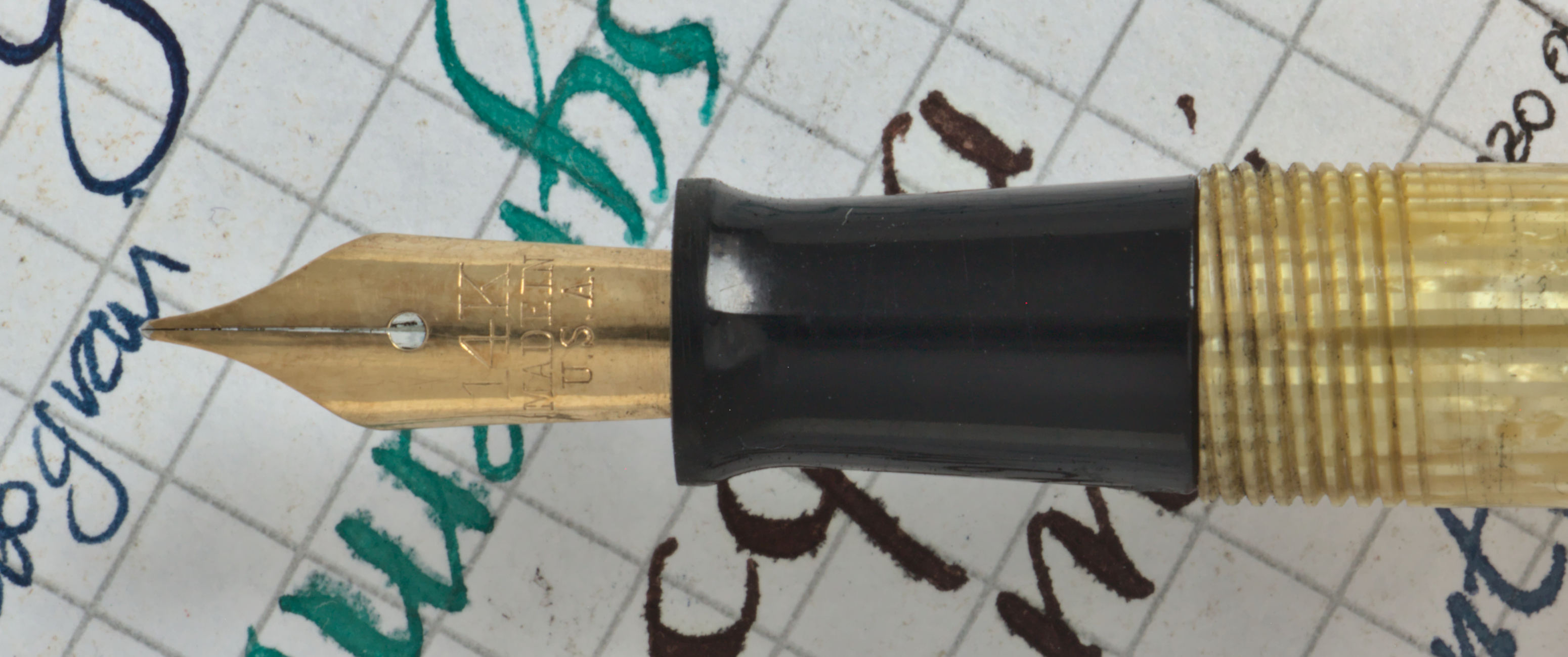 Foto di una penna Wearever. Caricamento a levetta. Realizzazione in celluloide rigata avorio. Dettaglio del pennino. Modello ignoto. Peculiare alimentatore trasparente.
