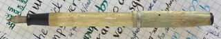 Photo of a pen produced by Wearever. Filling system: lever filler. In lined ivory celluloid. Unknown model. Peculiar transparent feeder.
