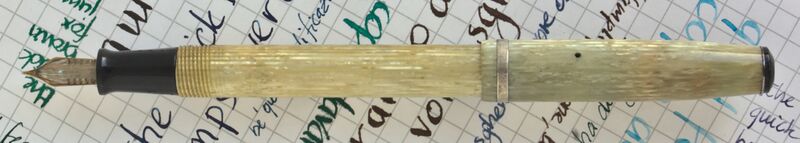 Foto di una penna Wearever. Caricamento a levetta. Realizzazione in celluloide rigata avorio. Modello ignoto. Peculiare alimentatore trasparente.
