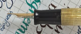 Foto di una penna Wearever. Caricamento a levetta. Realizzazione in celluloide rigata avorio. Dettaglio del pennino. Dettaglio dell'alimentatore. Modello ignoto. Peculiare alimentatore trasparente.