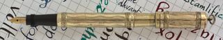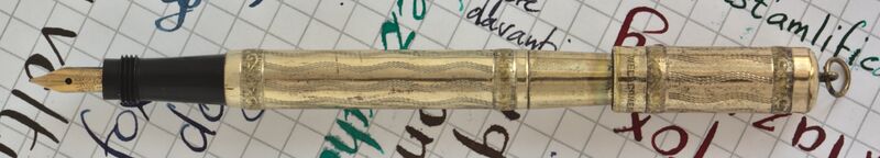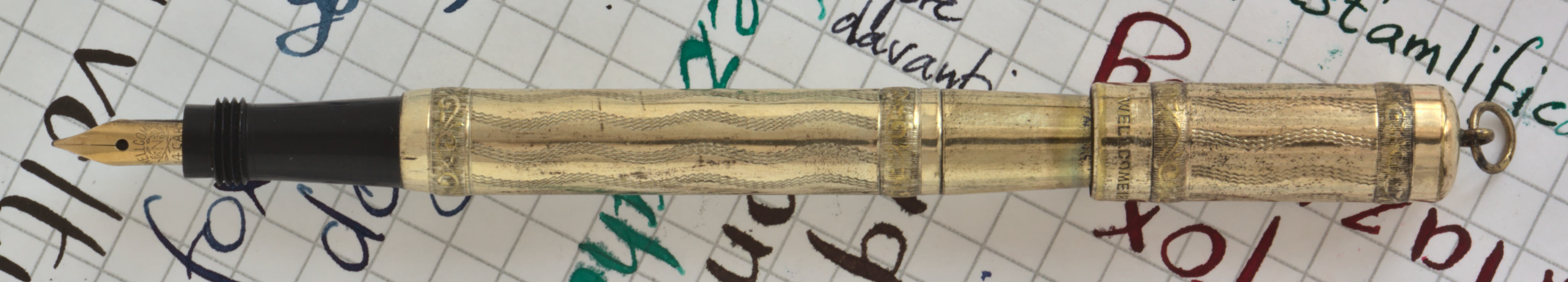 Photo of a pen produced by Wellcome. Filling system: safety. With with two bands and waved pattern gold rolled overlay. Unidentified model, marked "Wellcome 18 KR, followed by an N in a circle, also shown on the nib between intertwined branches.