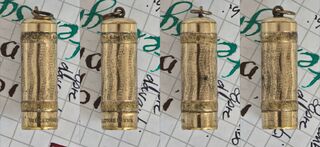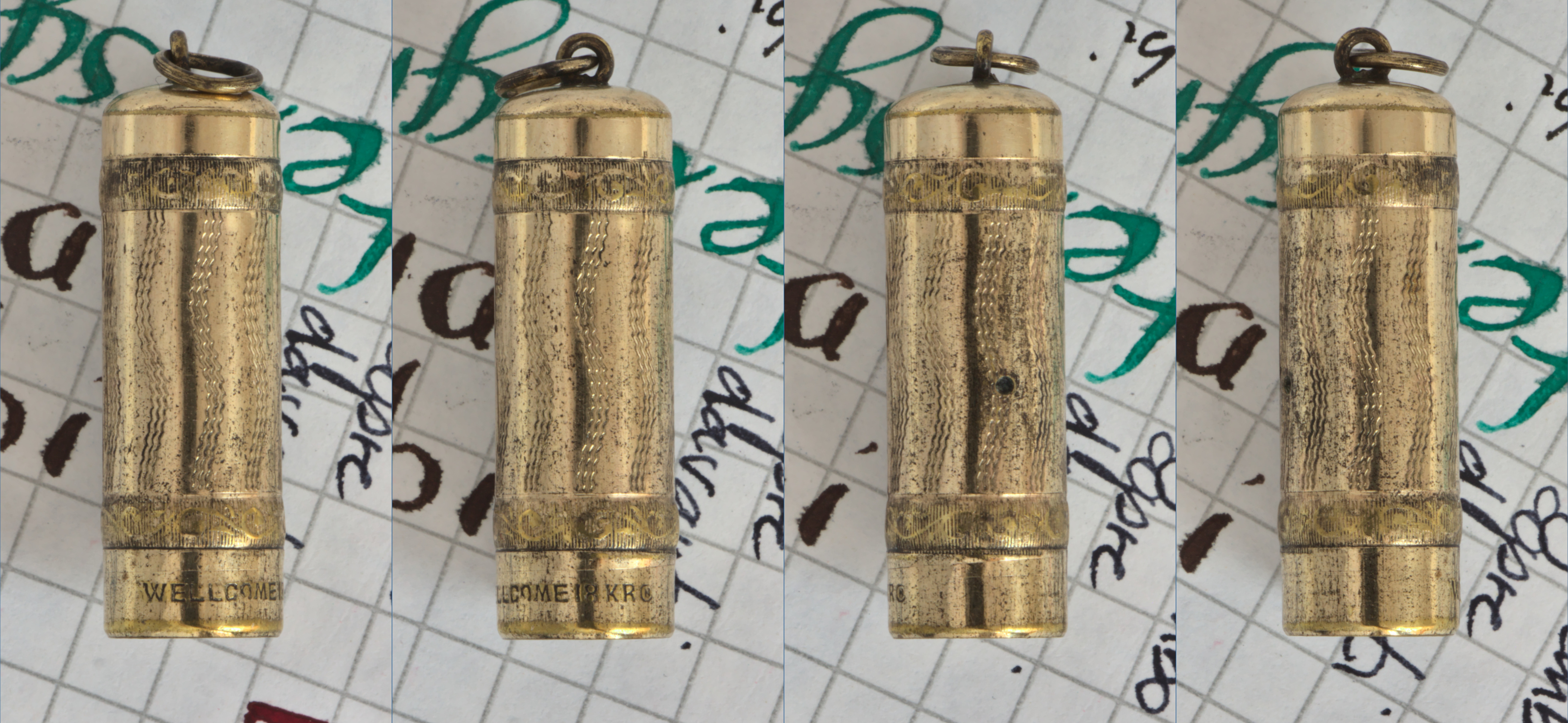 Photo of a pen produced by Wellcome. Filling system: safety. With with two bands and waved pattern gold rolled overlay. Detail of cap. Unidentified model, marked "Wellcome 18 KR, followed by an N in a circle, also shown on the nib between intertwined branches.
