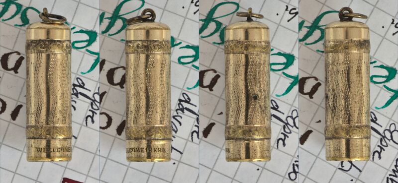 | attuale | 00:00, 26 mag 2024 | 5 208 × 2 400 (2,33 MB) | Piccardi (discussione | contributi) | == Dettagli == {{PhotoInfo |Marca=Wellcome |Oggetto=pen |Particolare=cap |Caricamento=safety |Materiale=overlay |MatDesc_it=con due bande e motivo ondulato |MatDesc_en=with two bands and waved pattern |Licenza=Cc-by-sa-3.0 |Note_it=Modello non identificato, marcato Wellcome 18 KR seguito una N in un cerchio, riportata anche sul pennino fra rami intrecciati. |Note_en=Unidentified model, marked "Wellcome 18 KR, followed by an N in a circle, also shown on the nib between intertwined bran... |