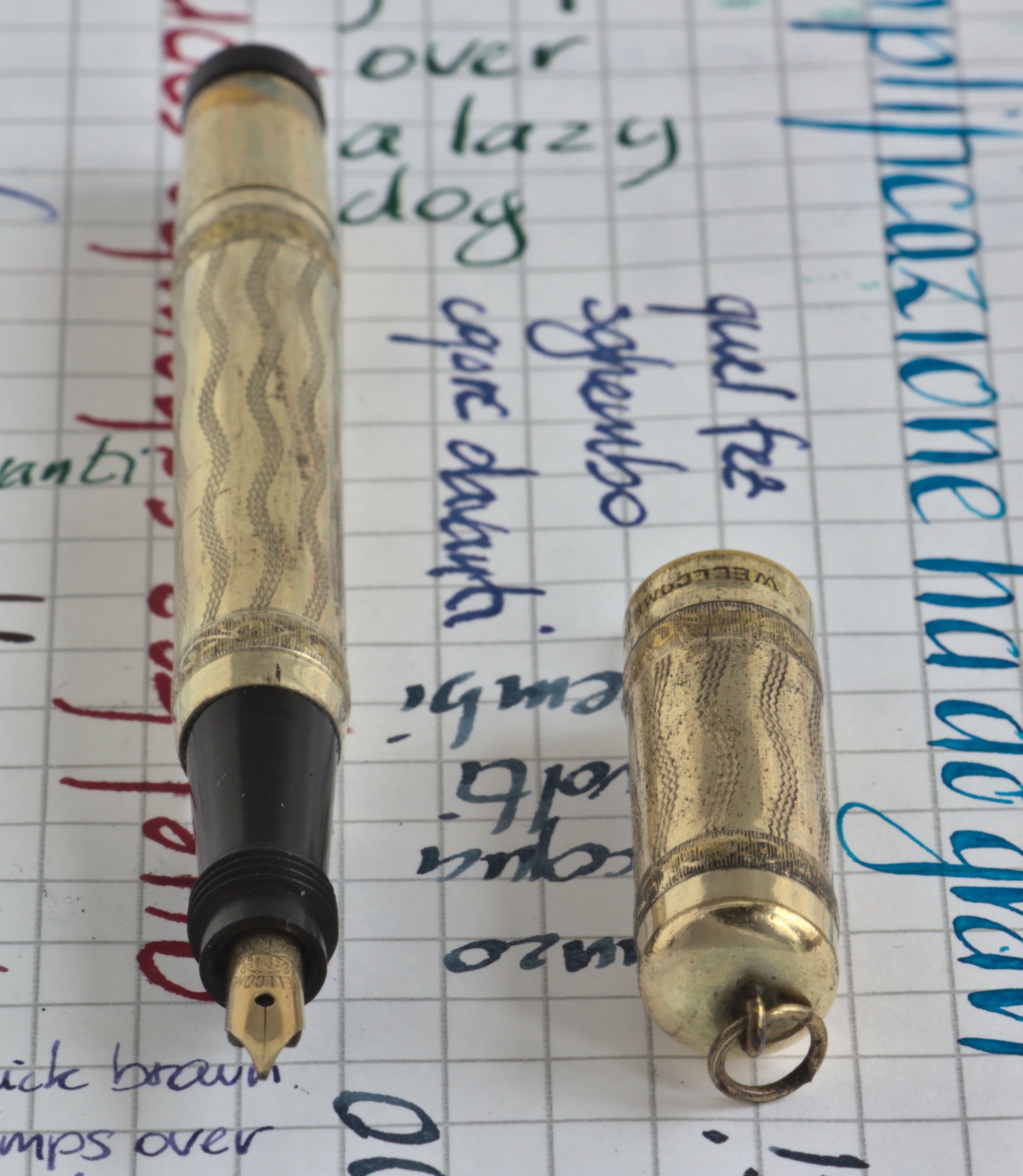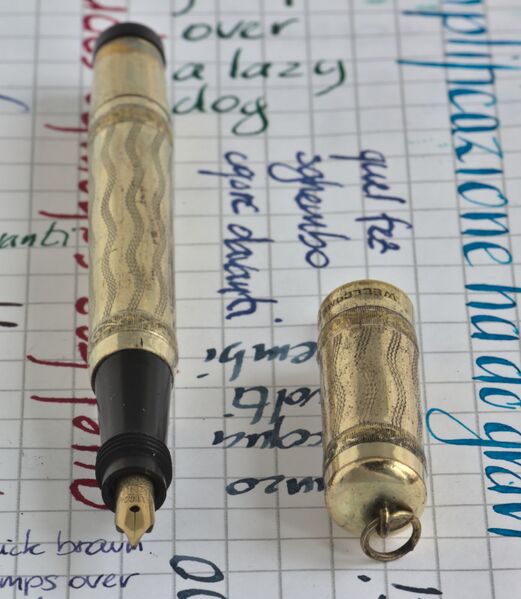 Foto di una penna Wellcome. Caricamento rientrante. Realizzazione con rivestimento laminato con due bande e motivo ondulato. Modello non identificato, marcato Wellcome 18 KR seguito una N in un cerchio, riportata anche sul pennino fra rami intrecciati.