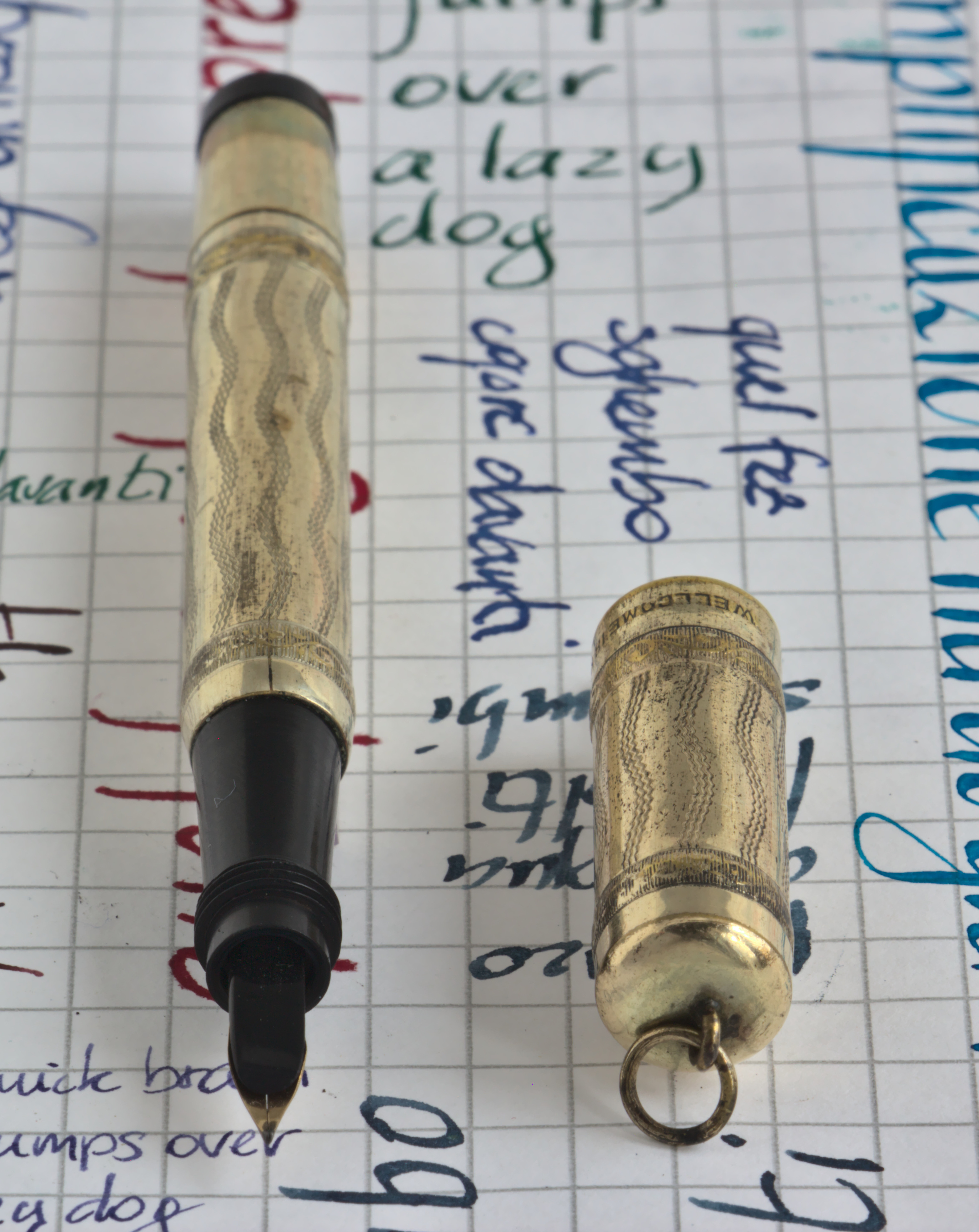 Foto di una penna Wellcome. Caricamento rientrante. Realizzazione con rivestimento laminato con due bande e motivo ondulato. Modello non identificato, marcato Wellcome 18 KR seguito una N in un cerchio, riportata anche sul pennino fra rami intrecciati.