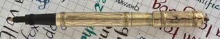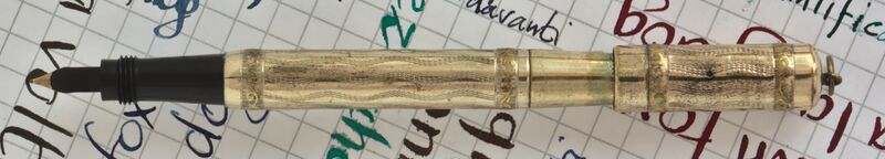 Photo of a pen produced by Wellcome. Filling system: safety. With with two bands and waved pattern gold rolled overlay. Unidentified model, marked "Wellcome 18 KR, followed by an N in a circle, also shown on the nib between intertwined branches.