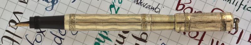 Photo of a pen produced by Wellcome. Filling system: safety. With with two bands and waved pattern gold rolled overlay. Unidentified model, marked "Wellcome 18 KR, followed by an N in a circle, also shown on the nib between intertwined branches.