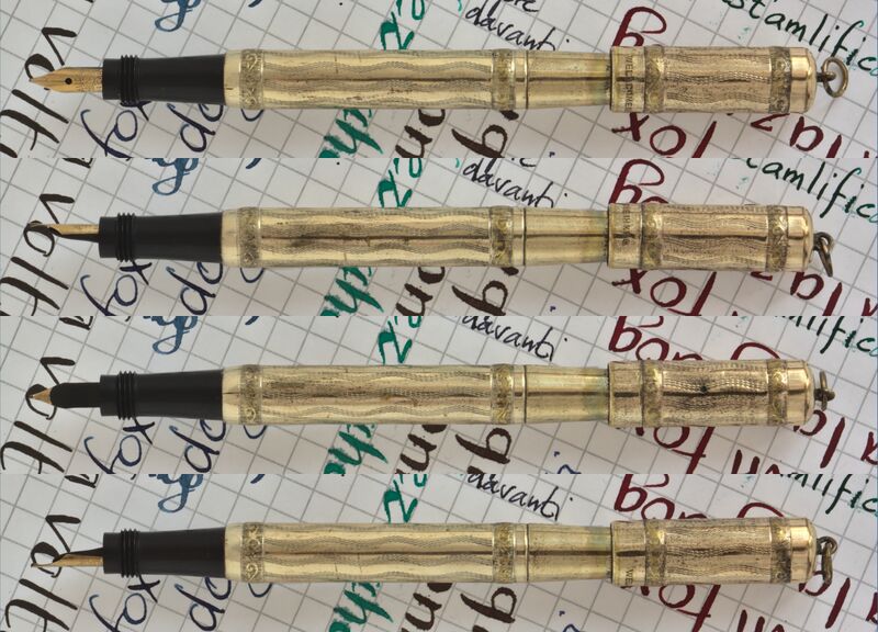 Photo of a pen produced by Wellcome. Filling system: safety. With with two bands and waved pattern gold rolled overlay. Unidentified model, marked "Wellcome 18 KR, followed by an N in a circle, also shown on the nib between intertwined branches.