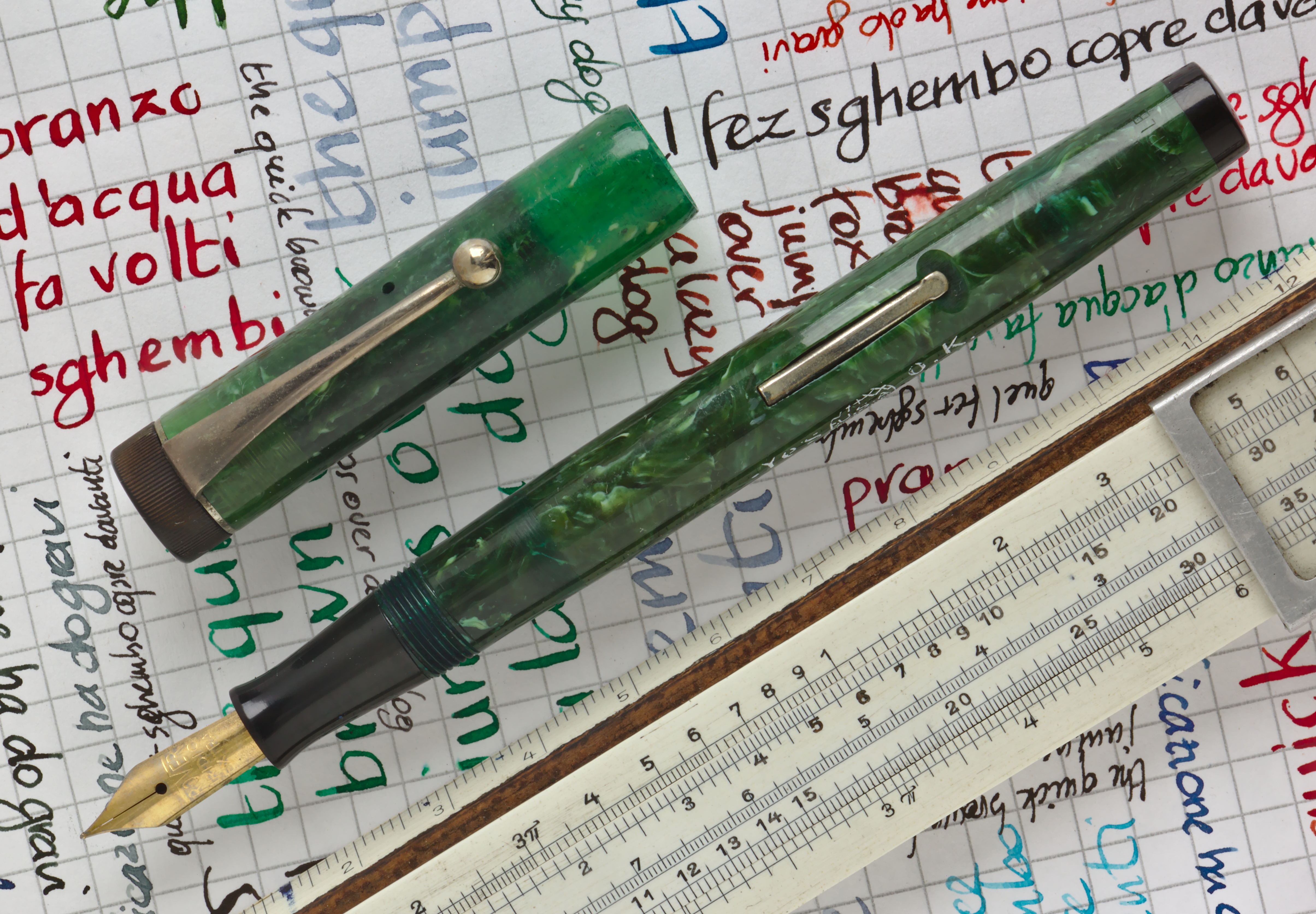 Foto di una penna Yes OK. Caricamento a levetta. Realizzazione in celluloide verde giada. Modello flat-top, pennino in acciaio Rover, reca la stampigliatura "Multiplex" (non è noto se si tratti del nome del modello) vicino al fondello.
