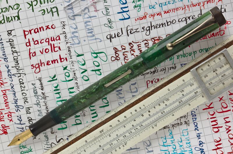 Foto di una penna Yes OK. Caricamento a levetta. Realizzazione in celluloide verde giada. Modello flat-top, pennino in acciaio Rover, reca la stampigliatura "Multiplex" (non è noto se si tratti del nome del modello) vicino al fondello.