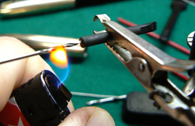 Con un accendino, scaldiamo la punta del trapano inserita nel tubetto, facendo attenzione a non avvicinarci troppo all'alimentatore (feed) per non danneggiarlo. Il tempo di "riscaldamento" è lasciato alla Vostra sensibilità. Direi che una decina di secondi dovrebbero bastare. In ogni caso meglio arrivare al risultato per iterazioni successive che danneggiare i pezzi al primo tentativo. Dopo una decina di secondi, tenendo da una parte l'alimentatore (feed) e dall'altra, (usando una pinza per non scottarvi le dita), la punta riscaldata e provate a tirare. Se i tempi sono stati corretti, il vostro pezzo di tubetto (breather tube) dovrebbe uscire come in fig. 5.