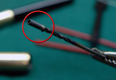 Per trovare un tubetto adatto, prima dobbiamo determinare le misure del tubetto originale: lunghezza, diametro esterno e diametro interno. Il diametro interno già lo conosciamo per avere inserito la punta da 1 mm, quindi possiamo supporre ragionevolmente che sia di circa 0,8 - 1 mm max (vedi fig. 7).