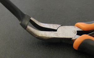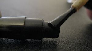 Una volta tagliato il sacchetto, si può procedere ad incollarlo alla sezione; innanzitutto si divarica l'imboccatura del sacchetto, utilizzando un apposito divaricatore per i sacchetti di gomma, oppure come in fig. 8, una pinza a becchi curvi (una pinza a becchi diritti non è adatta allo scopo). Dopodiché si spalma un velo di gommalacca sul collo della sezione (fig. 9), quindi si fa scivolare il sacchetto in sede e, mantenendo il sacchetto fermo sulla sezione si rimuove il divaricatore.