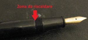 La rimozione della sezione dal fusto è un'operazione molto semplice, in quanto essa è semplicemente accoppiata al fusto per attrito/frizione. Non ci sono parti filettate. Per la rimozione è sufficiente riscaldare leggermente il fusto nella zona vicino alla sezione (fig. 4). Questa azione di riscaldamento favorisce sia la dilatazione del materiale, sia l'ammorbidimento dell'eventuale collante sottostante. Dopodiché è sufficiente tirare compiendo contemporaneamente lievi movimenti rotatori in entrambi i sensi in modo da aiutare la rimozione. E' bene limitare l'ampiezza dei movimenti di torsione, che potrebbero danneggiare la penna.