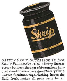 A partire dal 1929 circa, (almeno a quanto risulta da questa pubblicità), la Sheaffer introdusse sul mercato una particolare versione delle proprie boccette di inchiostro, dotata di una speciale chiusura di sicurezza denomimata Safety Skrip, illustrate nell'immagine a fianco.