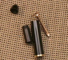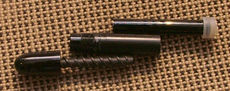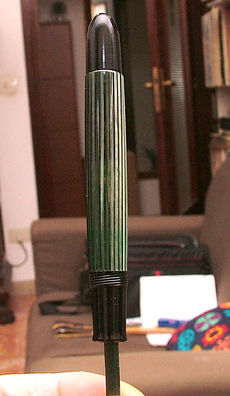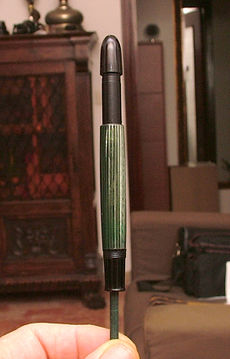 Una volta svitato il gruppo pennino/alimentatore dalla sezione si può passare all'estrazione del meccanismo del caricamento a stantuffo. Per farlo il pistone deve trovarsi nella posizione in cui è completamente alzato verso il fondello posteriore (cioè il pistone deve essere prima completamente ritratto all'interno del corpo della penna, come in fig. 3).