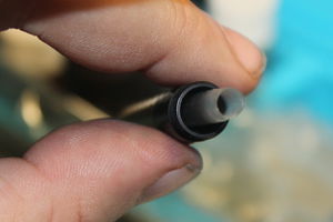 Si distribuisca lo shellac sul collare della sezione prendendolo dalla sua boccetta (o da dove lo tenete) con uno stecchino da denti: è bene che sia piuttosto liquido (nelle foto si ne è usato uno molto denso e se ne è messo molto per renderlo più visibile, si è dovuto poi "diluirlo" con un po' di alcol). L'unica precauzione da prendere è quella di stare attenti a non ostruire il canale dell'alimentatore, altrimenti si potrebbe anche essere costretti a smontare la sezione per poterlo ripulire (se si è davvero esagerato, se la cosa è superficiale basta il solito panno con l'alcol).