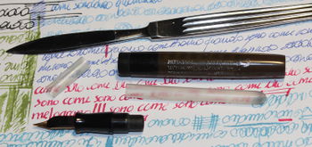 Non fate l'errore di montare il sacchetto più grande possibile che entra nel fusto, nell'illusione di aumentare la capacità del serbatoio: i fattori che determinano la durata del serbatoio sono altri, con un sacchetto troppo grande si rischia solo una usura precoce, con conseguenti macchie di inchiostro nella camicia o nella borsa alla sua rottura. Un sacchetto più piccolo è preferibile anche per una migliore efficienza di riempimento del meccanismo di caricamento, che riesce a stringerlo meglio, e per il miglior isolamento termico che si riesce a ottenere per lo strato d'aria fra il sacchetto ed il corpo della penna che evita il gocciolamento a penna quasi vuota per le variazioni di pressione dell'aria nel serbatoio dovute all'innalzamento di temperatura col calore della mano.
