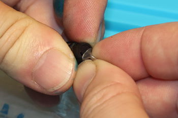 Per quanto l'uso di uno strumento apposito possa sembrare facilitante, l'esperienza di un riparatore professionale come Frank Dubiel suggerisce che alla fine è molto più semplice fare le cose usando direttamente le mani. Il suo suggerimento è quello di prendere il sacchetto fra le due dita della destra, ed abboccarlo sul collare tenendo la sezione con l'altra mano come illustrato in figura 14, per poi spingerlo in posizione sopra il collare usandone la flessibilità. Una volta abboccato si spinga il sacchetto fino al fondo del collare aiutandosi anche con le unghie (attenzione a non esagerare e a non strapparlo). La foto è stata fatta, per semplicità, prima di mettere lo shellac, con lo shellac applicato ci si sporcheranno le dita, ma fa parte del gioco. Le prime volte si farà più fatica, ma una volta presa la mano la manovra finisce per risultare molto più veloce e sicura delle acrobazie con gli attrezzi.