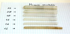 Se allora si misura all'imboccatura del fusto un diametro interno della penna pari 8.4 mm, si dovrà stimare un diametro utile interno di 8.4-0.9*2 = 6.6 mm, ed il sacchetto da scegliere dovrà avere un diametro inferiore a questo valore. Se convertiamo il precedente risultato da millimetri a sessantaquattresimi di pollice per avere una indicazione di quale sia la "misura" adeguata per il sacchetto otterremo 6.6*64/25.4 = 16.6. Si dovrà quindi scegliere un sacchetto da 16 dato che questo deve essere più piccolo della dimensione massima possibile.