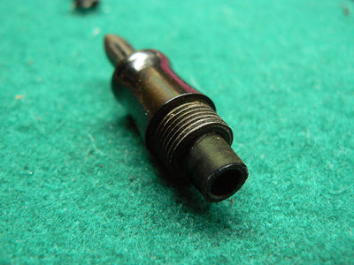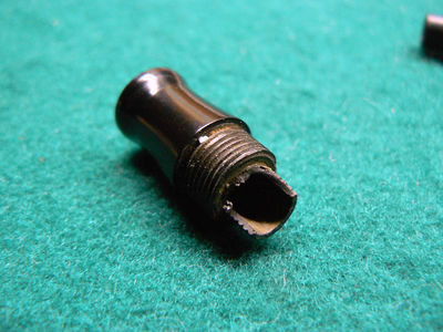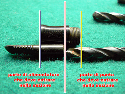 Con il termine di "caratterizzare la penna" si intende che, se per esempio, la penna è Parker o Waterman monterà un proprio alimentatore che sarà caratteristico per quel modello. Ovviamente cambiarlo con uno simile ma non uguale farà sì che la riparazione sia evidente. Ben diverso è sostituire un alimentatore con uno analogo su una marca minore che utilizzava magari degli alimentatori comuni con altri modelli. Sapendo ora per quanti millimetri è possibile fare entrare il tubetto nella sezione, dovremo iniziare a forare quest'ultima come in figura 7 (a sinistra).