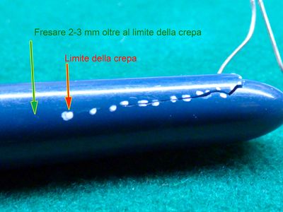 Per prima cosa dobbiamo individuare bene la zona della rottura, aiutandoci magari con una lente. In questo caso (vedi fig. 2), con un pennarello bianco sono stati tracciati dei punti lungo la linea della frattura e serviranno come indicazione visiva per la successiva asportazione di materiale.