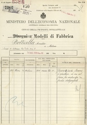 | 22:26, 2 set 2025 | Privativa-Industriale-6388.pdf (file) | 2,35 MB | Piccardi | == Dettagli == {{InfoModello |Numero=6388 |Data=1929-05-16 |Richiesto=1928-03-24 |Titolare=Arnaldo Botticella |Tipo=di fabbrica |Titolo=Flacone e porta flacone di sicurezza in un sol pezzo per inchiostro da penne stilografiche |Domanda=150 |Ufficio=Milano |Fonte=[https://tecadigitaleacs.cultura.gov.it/media/ricercadl?rictree=MINISTERO+DELL%27INDUSTRIA%2c+DEL+COMMERCIO+E+DELL%27ARTIGIANATO%2fUFFICIO+ITALIANO+BREVETTI+E+MARCHI%2fArchivio+generale%2fModelli%2fBrevetti+dal+n.+1+al+n.+100.000 Arch... | 1 | |