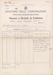 | 18:25, 4 set 2025 | Privativa-Industriale-18903.pdf (file) | 1,78 MB | Piccardi | == Dettagli == {{InfoModello |Numero=18903 |Data=1940-10-31 |Richiesto=1940-10-25 |Titolare=Fabbrica Articoli Stilografici "F.A.S." |Tipo=di fabbrica |Titolo=Fermaglio (clips) per penne stilografiche e matite automatiche, da costruirsi in materiali e dimensioni varie |Domanda=1085 |Ufficio=Modena |Fonte=[https://tecadigitaleacs.cultura.gov.it/media/ricercadl?rictree=MINISTERO+DELL%27INDUSTRIA%2c+DEL+COMMERCIO+E+DELL%27ARTIGIANATO%2fUFFICIO+ITALIANO+BREVETTI+E+MARCHI%2fArchivio+generale%2fMode... | 1 | |