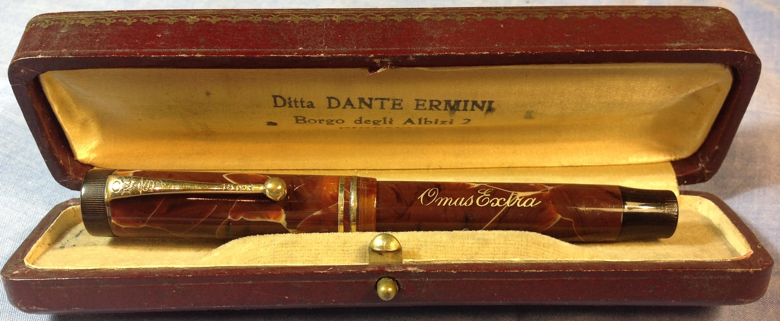 Foto di una penna Omas. Modello: Omas Tipo Duofold. Caricamento a pulsante di fondo. Realizzazione in celluloide marrone venata crema. Misura piccola. Modello in stile Duofold. Contributo di Massimo, utente forum Maxpen2012.