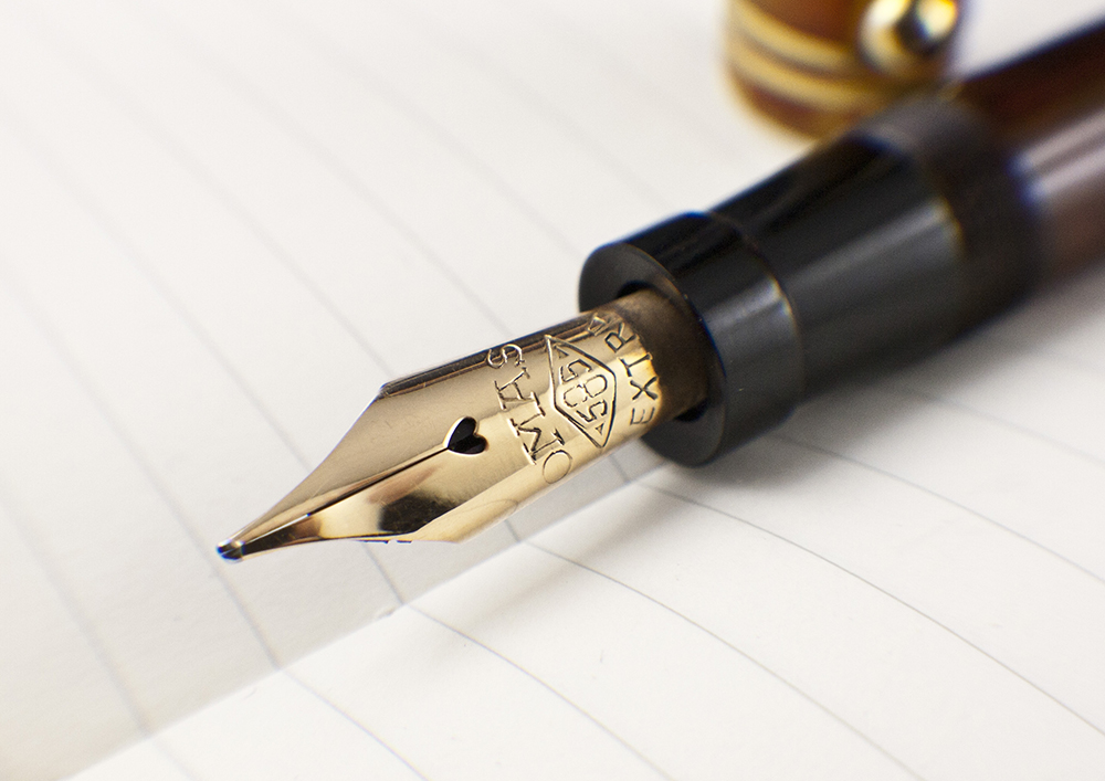 Photo of a pen produced by Omas marked "Omas Extra". Filling system: lever filler. In striated brown celluloid. Detail of nib. Transitional model, in streamlined style.