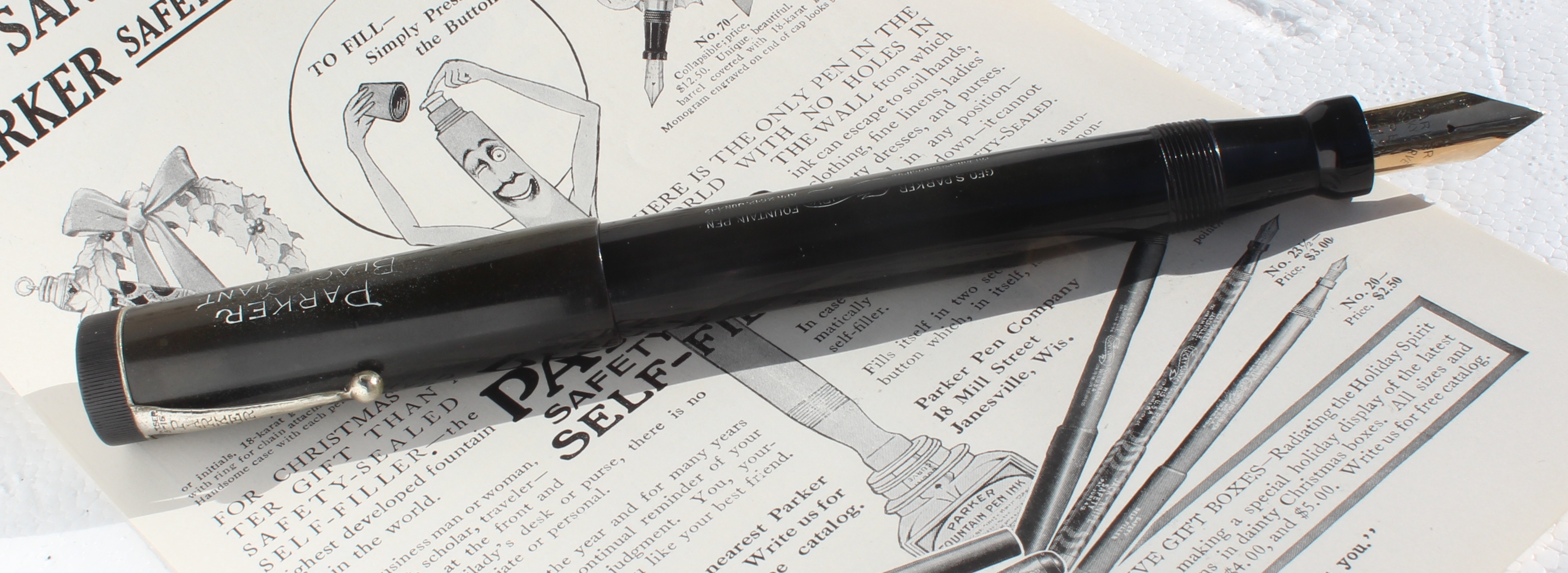 Foto di una penna Parker. Modello: Black Giant. Caricamento a contagocce. Realizzazione in ebanite nera. Fotografata all'incontro Penneggiando in Maremma.