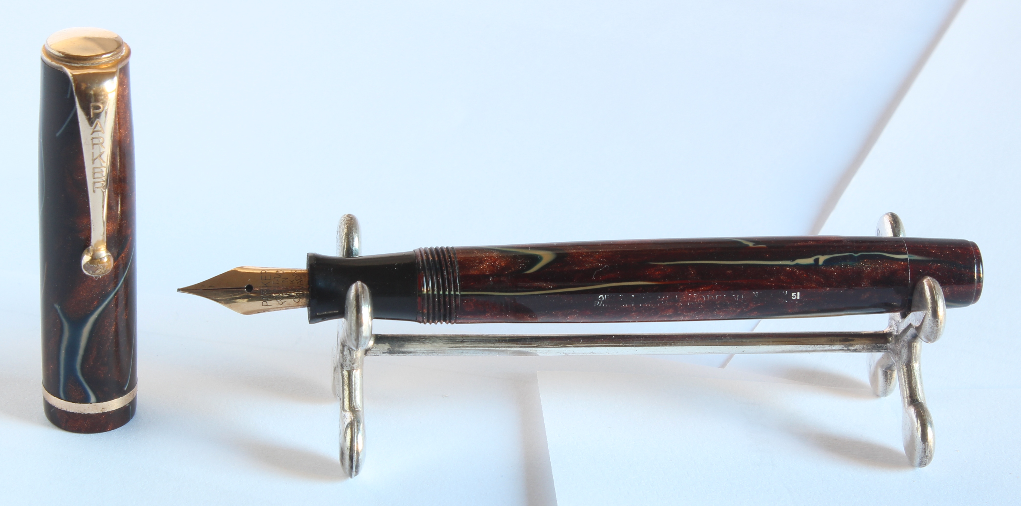 Foto di una penna Parker. Modello: Parker Moderne. Caricamento a pulsante di fondo. Realizzazione in celluloide bronzo a venature blu e bianche. Uno dei modelli che vanno sotto il nome generico di "Depression era pen".