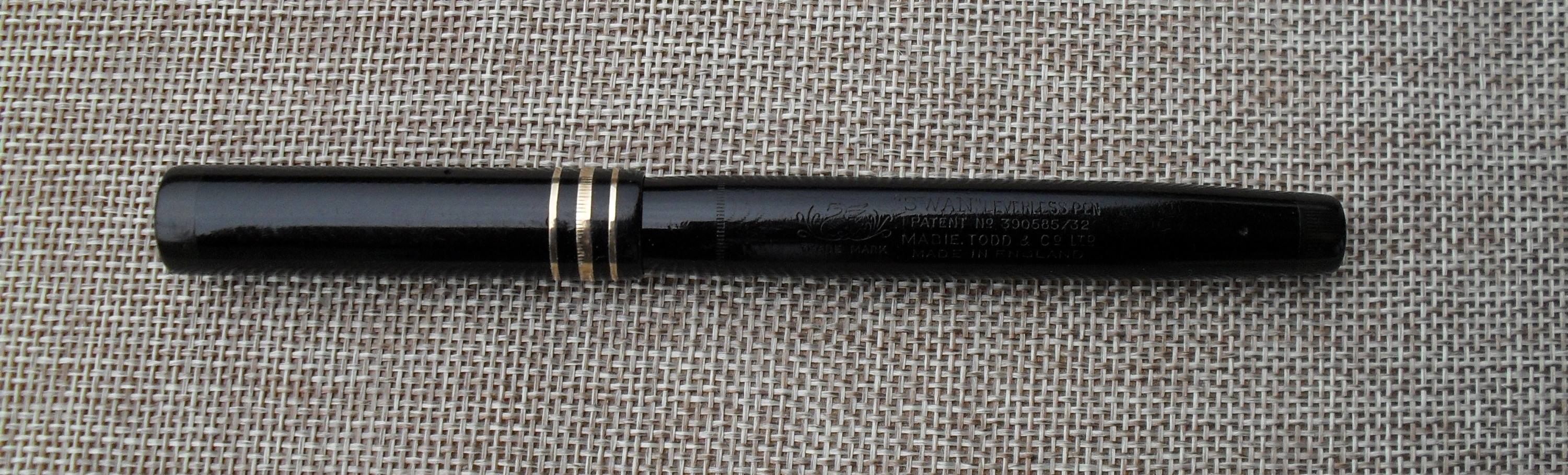 Photo of a pen produced by Swan. Model: Leverless Pen. Filling system: "Leverless". In black celluloid. Model marked 24/60, without clip. With the patent nº GB-390585 imprint in the barrel.