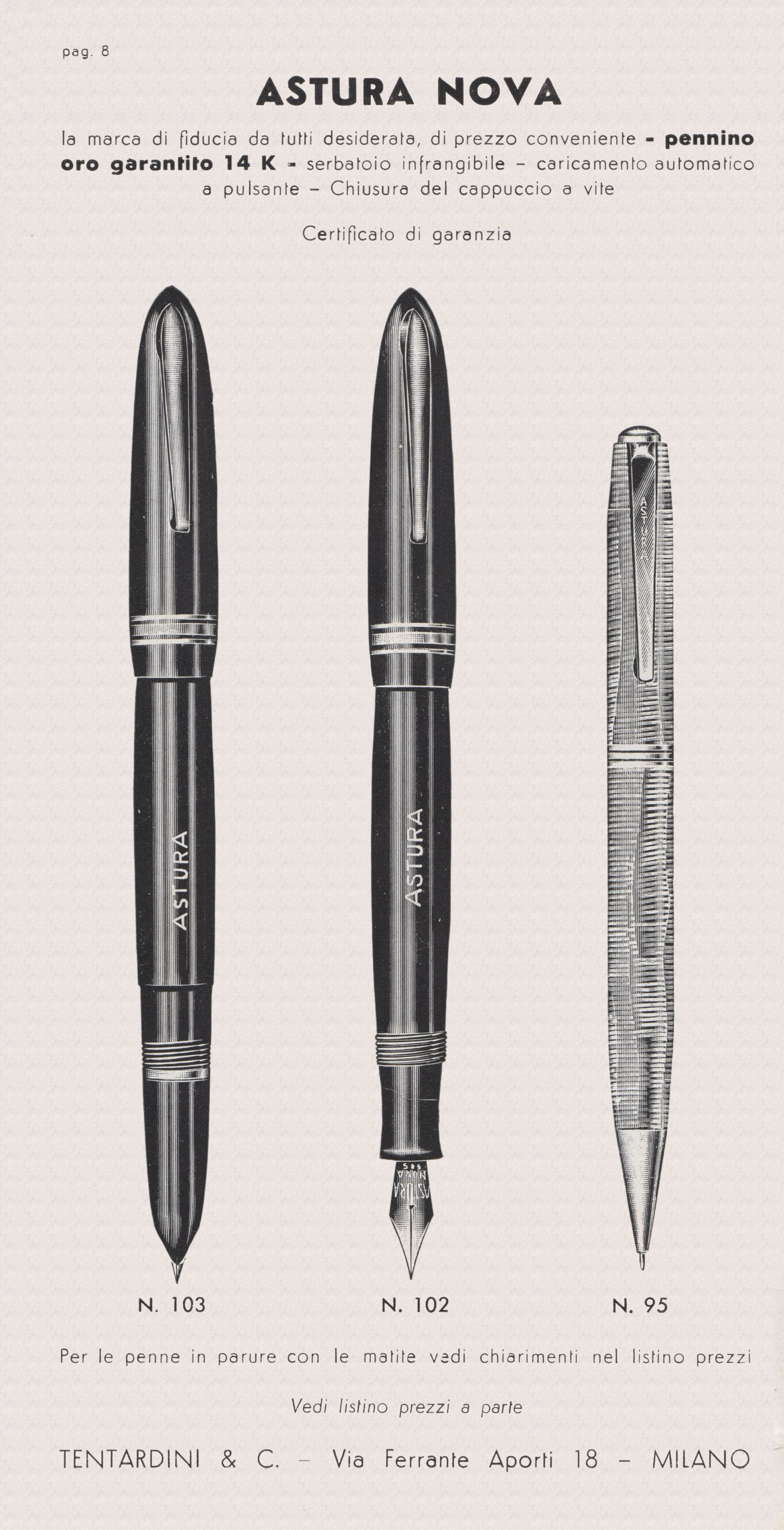 Scansione di una pagina di catalogo datata 1954. Pubblicazione su: Ditta Tentardini & C. Milano. Ritoccata dall'autore per una migliore nitidezza. Contributo di Giorgio (utente forum Musicus). Data indicativa, desunta dai modelli riportati. Ottava pagina. Pubblicizza dei modelli Astura ogivali con caricamento a pulsante di fondo in resina plasica: 103 con pennino coperto e 102 con pennino normale.