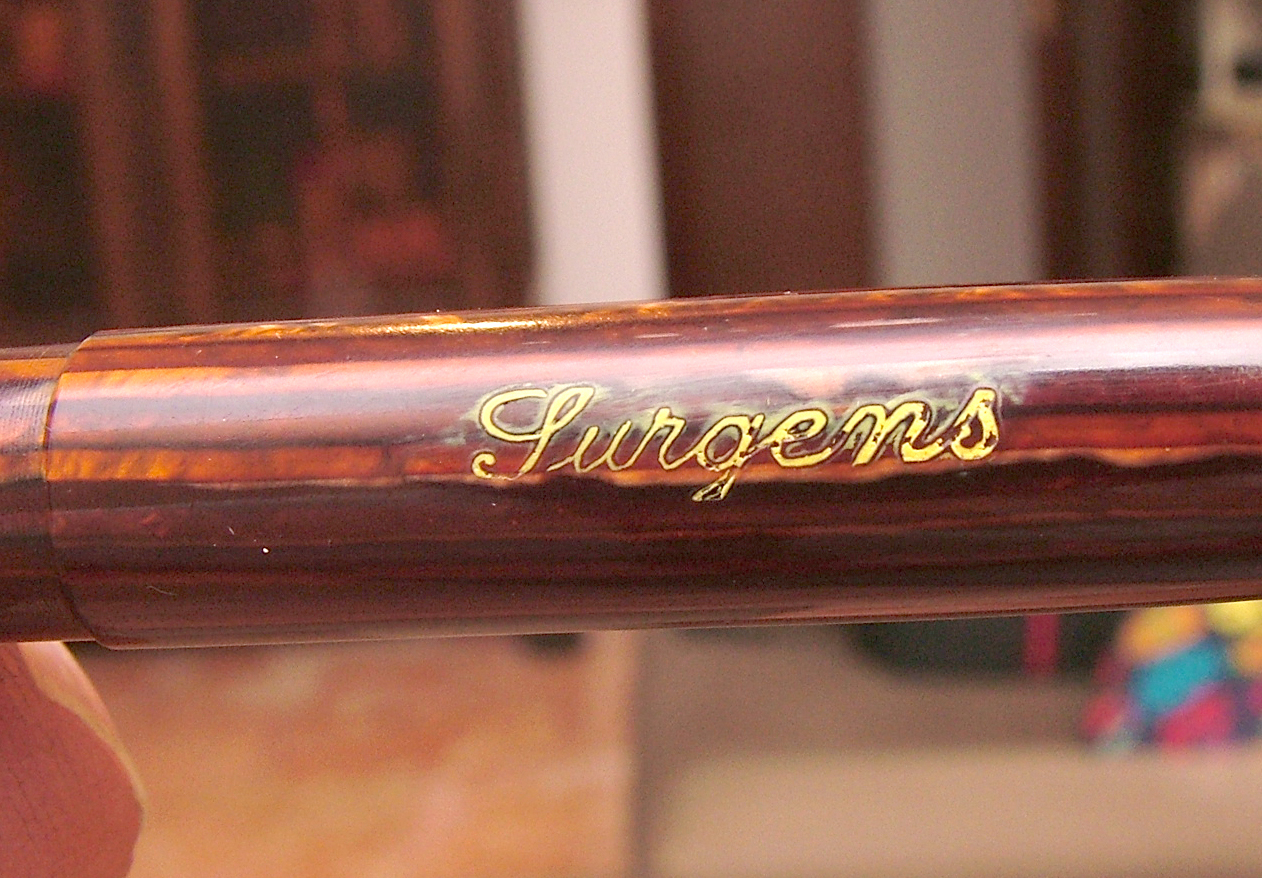 ({{PhotoInfo |Marca=Surgens |Oggetto=pen |Particolare=inscr |Contributo=maxpop |Caricamento=button |Materiale=celluloide |MatDesc_it=striata marrone |MatDesc_en=striated brown |Licenza=Cc-by-sa-3.0 |Note_it=Modello ignoto. |Note_en=Unknown model. }}) |