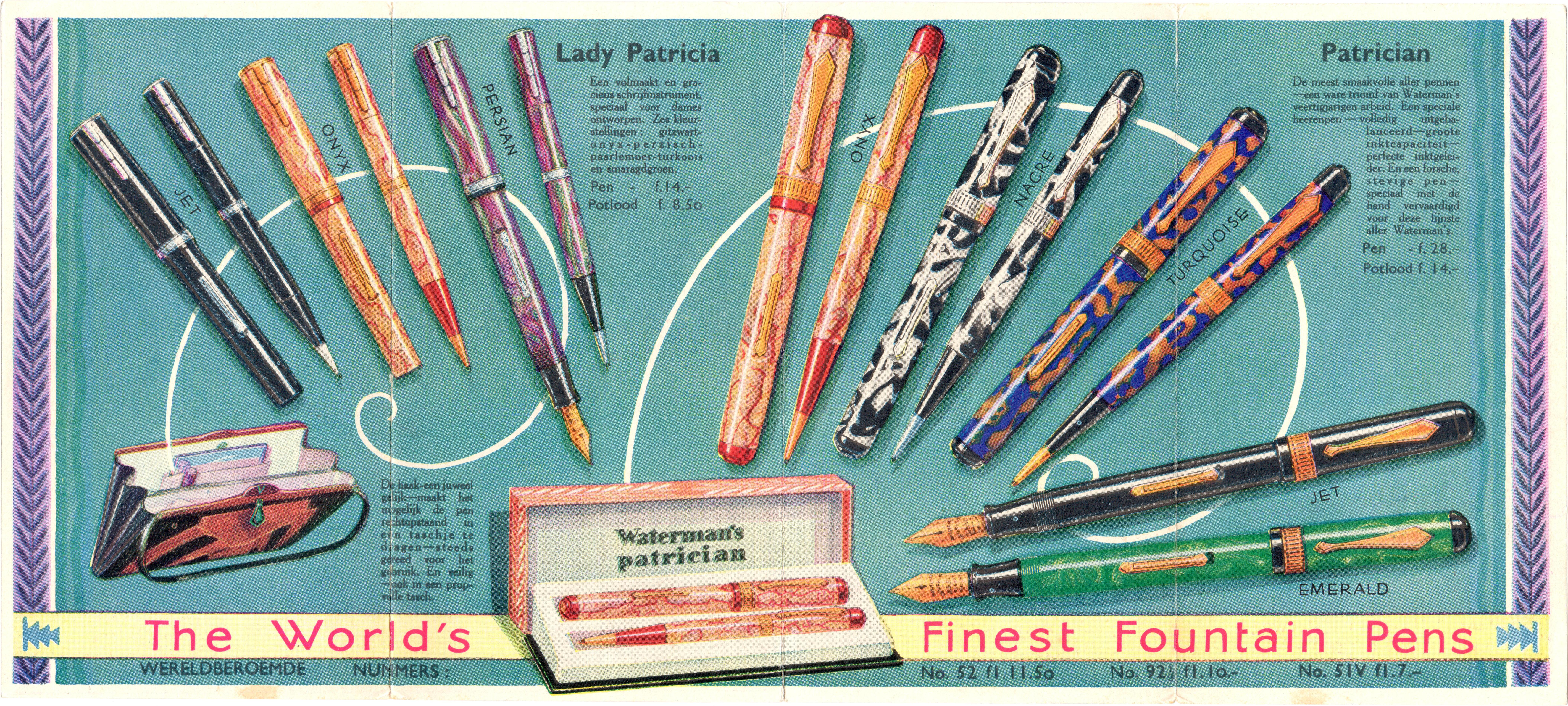 Scanning of a brochure from Waterman dated 1931. Retouched by the author for a better sharpness. Dating given by the provider. Advertising for models of that time: Patrician, Lady Patricia, 52, No. 92 and No. 94 models. External side. On the other side of File:1931-Waterman-Patrician-Brochure-EtAl-Ext.jpg.