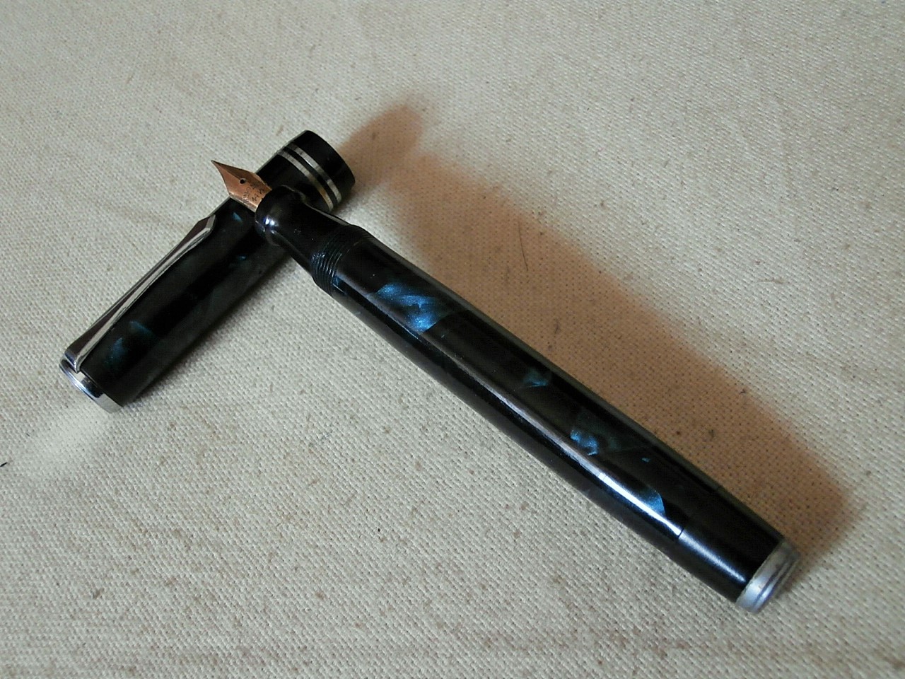 Foto di una penna Asco (sottomarca Fabbrica Italiana Penne a Serbatoio Aurora). Realizzazione in celluloide marmorizzata blu. Contributo di Fabrizio Falchi, (utente forum fountainpen.it fab66).