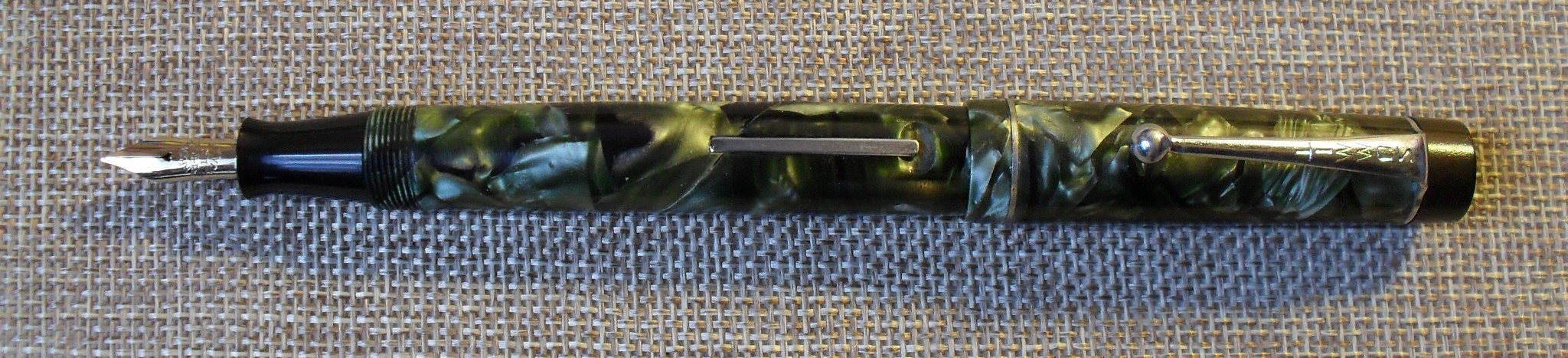 Foto di una penna Summit (un marchio della Lang - Curzon - Summit). Modello: Summit Cadet. Caricamento a levetta. Realizzazione in celluloide marmorizzata verde. Modello economico S.100, produzione dell'immediato dopoguerra (1946 circa). Contributo di Alberto (utente forum A Casirati).